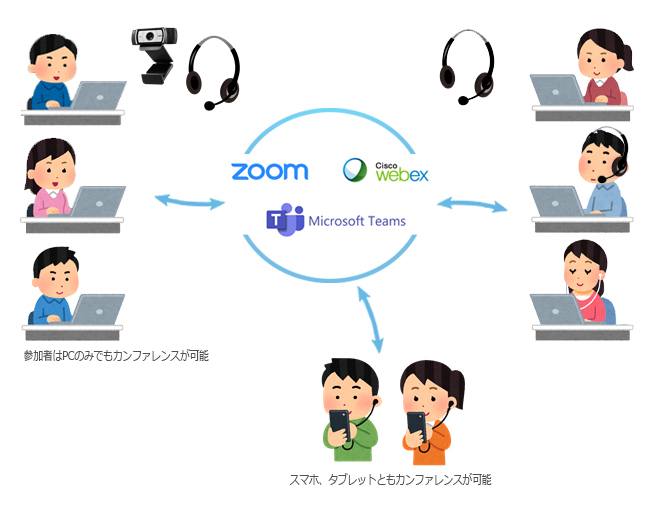 インターネットに接続されたカメラ・マイク・スピーカー内蔵PCもしくは外付けのカメラ及びヘッドセット等とZoom、WebexなどのWeb会議サービスのみでWebカンファレンスが可能です。スマホやタブレットなどからも会議への参加が出来ます。
