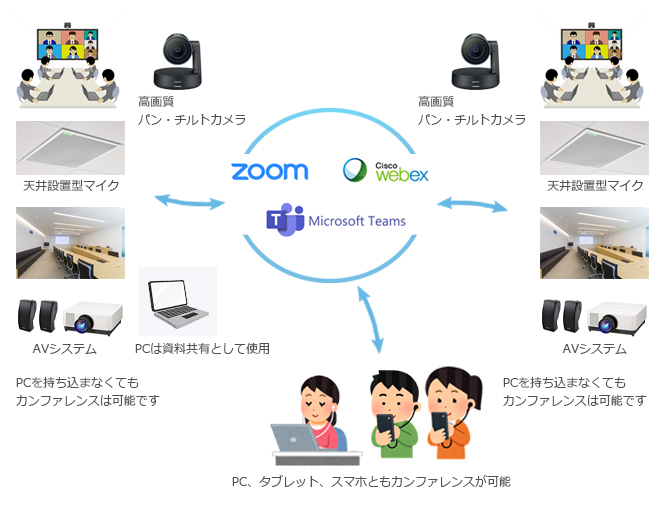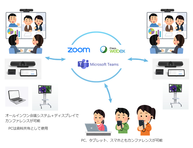 インターネットに接続されたオールインワン会議システム(カメラ、マイク、スピーカー、miniPCのセット)とディスプレイなどの表示装置があればZoom、WebexなどのWeb会議サービスを使用してWebカンファレンスが可能です。会議室へPCを持ち込まなくてもカンファレンスが出来ます。また、持ち込みPCによる資料共有も可。PC、スマホやタブレットなどからも会議への参加が出来ます。