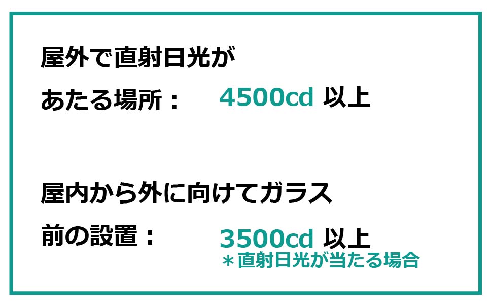 | 屋外用 | 4000 ~ 8000cd | 1000 ~ 2000cd |