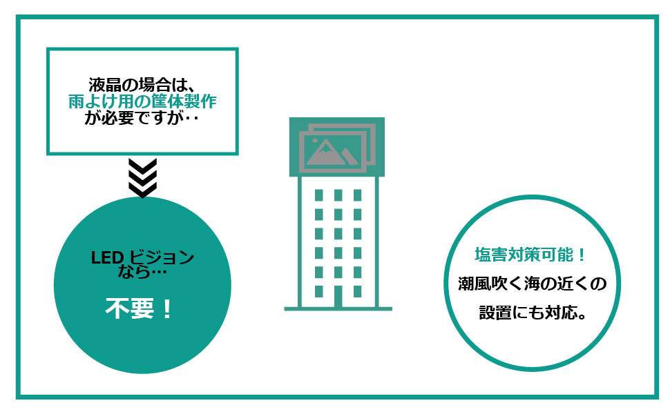 屋外用LEDビジョンは、本体もケーブルも防水防塵なので、外にそのまま置いてOK!