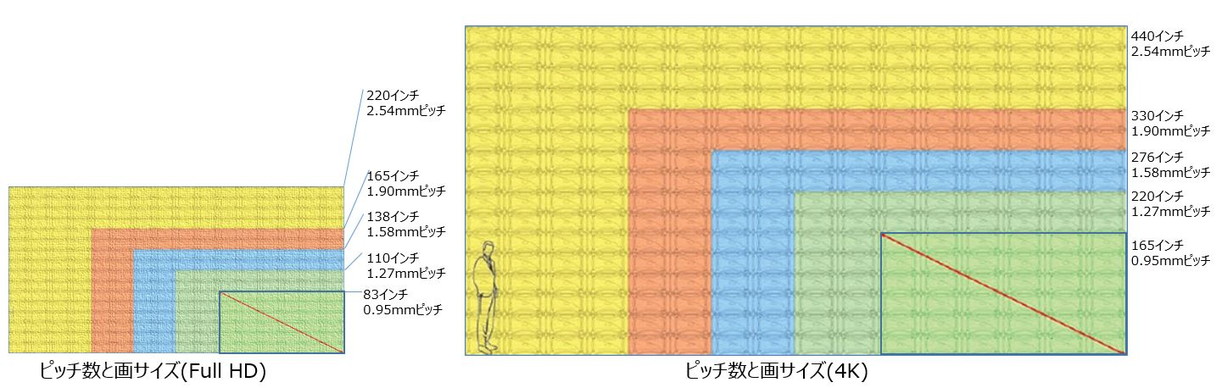 大型LEDディスプレイでは、表示画面の大きさ(画サイズ)とLED画素ピッチの両方が変化し、合わせて画素数も変化して行きます。
