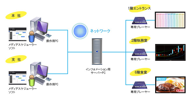 本システムはサーバ/クライアント方式の採用により、複数の担当者やPCから表示用コンテンツの登録・修正・削除等の運用が出来ます。全ての登録コンテンツやスケジュールをサーバーで一括管理するため、一元的な管理運用を可能としております。また、全世界でローコスト&安定稼働を実現しているBrightSignシステムとメディアスケジューラーソフトとの連動を行うことで、安価で発展的なサイネージシステムの構築が可能です。